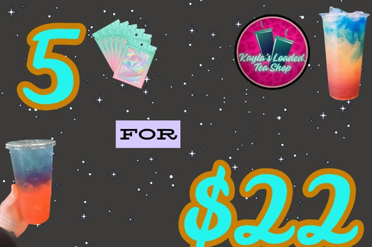 5 Loaded Teas For $22 sugar-free powder drink mix. Each Loaded tea package is 200 MG caffeine. You will recieve 5 individual packages.
